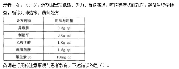 A.必须全程遵循医嘱用药,不能擅自停药 B.异烟肼可引起肝毒性,用药期间应定期监测肝功能 C.用药期间应定期评估视觉功能,防止乙胺丁醇引发球后视神经炎...