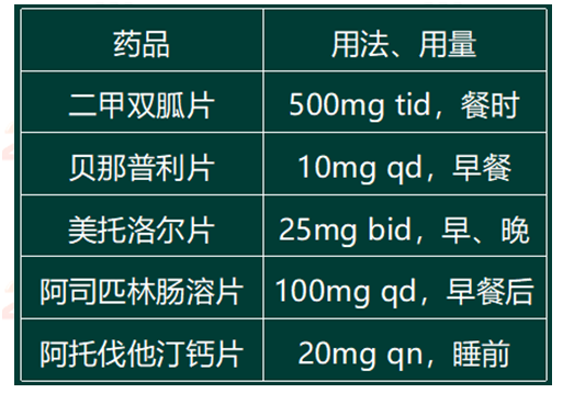 选项 A.二甲双胍片 B.贝那普利片 C.阿司匹林肠溶片 D.美托洛尔片 E.阿托伐他汀钙片