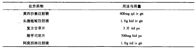 患者,女,72岁,因“发热、咳嗽、咳痰”入院。查体:T39.2℃,P110次/分,R29次/分。血常规:WBC17.2×109/L。胸部X线检查显示右肺浸...