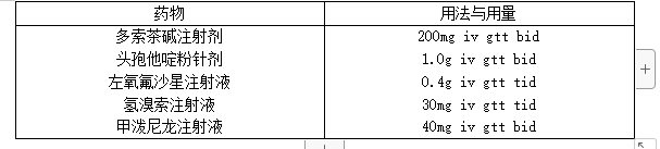 问题 患者,女,81岁,因“咳嗽、气促10年余,再发加重1周”入院。入院查体:气急加重,咳嗽、咳黏稠脓性痰;T38.2℃,P95次/分,R18次/分;双肺呼吸音粗,双肺可闻及湿性啰音。血常规:WBC16.5×109/L。排除其他疾病因素后确诊为“慢性阻塞性肺疾病(急性加重期)、感染性肺炎”。既往病史:急性心肌梗死。医师处方: