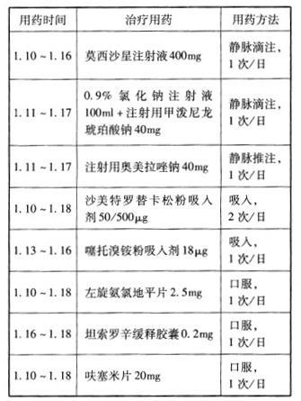 问题 共用题干 患者,男,72岁,体重55kg,因“因反复咳嗽、咳痰5年,气短2年,加重1周”之主诉人院。入院后患者呼吸困难加重,查体:T36.8℃,BP130/88mmHg,P100bpm,R28bpm,颈静脉怒张,桶状胸,双肺可闻及少量细湿性啰音,未闻及干哕音,双下肢轻度水肿。血气分析示轻度低氧血症。电解质:K+3.5mmol/L,Na+136mmol/L,Cl-103mmol/L。血常规未见明显异常。以“慢性阻塞性肺疾病急性加重期”收住院,否认食物、药物过敏史。医嘱: