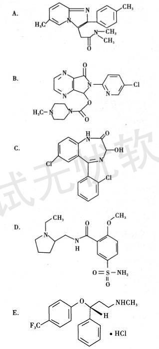 解析 重点考查佐匹克隆的化学结构。A为唑吡坦,C为劳拉西泮,D为舒比利,E为盐酸氟西汀。