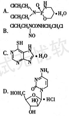 解析 本题考查亚硝基脲类的化学结构。亚硝基脲类抗肿瘤药结构中含有2-氯乙基具有较强的亲脂性,因此这类药物易于通过血脑屏障,选项B结构为卡莫司汀。故本题选B.
