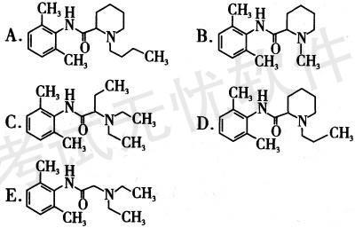 解析 本题考查2,6 -二甲基酰胺类药物的化学结构。本题的答案均为2,6-二甲基酰胺类药物的化学结构,其差别是取代基不同。哌啶环N上连甲基,为甲哌卡因;哌啶环N上连丙基,为罗哌卡因;呢啶环N上连丁基(Bu即丁基译为“布”)。所以为布比卡因,而C为依替卡因,E为利多卡因。故本题选A。