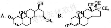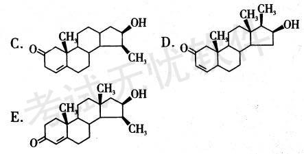 解析 本题考查甲睾酮的化学结构。甲 睾酮的化学结构是17α-甲基睾酮结构,而A、C、D、E 由于甲基和羟基取代的位置与其不符。故本题选B。