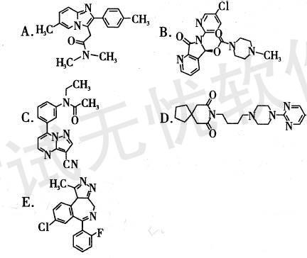 解析 本组题考査苯二氮罩类等药物的体内代谢及结构式。选项A为唑吡坦、B为艾司佐匹克隆、C 为扎来普隆、D为丁螺环酮、E为咪达唑仑。唑吡坦 口服吸收迅速,在体内被氧化代谢为无活性的喹吡迫羧酸;艾司佐匹克隆口服吸收迅速,生物利用度高达 80 %,在体内代谢成去甲基艾司佐匹克隆;扎来普隆 口服吸收迅速,口服给药后很快代谢成无活性的5 - 氧代扎来普隆;丁螺环酮口服吸收完全,口服给药后很快代谢成6-羟基丁螺环酮,产生临床疗效。故本题组分别选C。