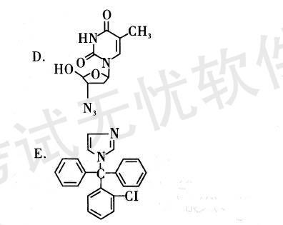 解析 本组题考查药物结构式及作用机制。D 项为齐多夫定结构式,齐多夫定为胸苷的类似物,在 其脱氧核糖部分的3位上以叠氮基取代,它可以对能引起艾滋病病毒和T细胞白血病的RNA肿瘤病毒有 抑制作用,为抗逆转酶病毒药物;C项为乙胺嘧啶,依据2,4-二氨基嘧腚能抑制疟原虫的二氢叶酸还原酶,设想这类衍生物也可能有抗疟活性,发现乙胺嘧啶及硝喹均对疟疾具有较好的预防和治疗作用。乙 胺嘧啶为二氢叶酸还原酶抑制剂,使核酸合成减少,通过抑制细胞核的分裂,使疟原虫的繁殖受到抑制。 本品主要用于预防疟疾,其特点是作用持久,服药1 次作用可维持1周以上。为了杀灭耐乙胺嘧啶虫株,近年来国外将乙胺嘧啶和二氢叶酸合成酶抑制剂磺 胺多辛一起组成复合制剂,则可起到双重抑制作用;B项为甲氧苄啶,本品与磺胺类药物,如磺胺甲噁唑或磺胺嘧啶合用,可使其抗菌作用增强数倍至数十倍, 甚至有杀菌作用。而且可减少耐药菌株的产生,增强 多种抗生素的抗菌作用。由于人和动物辅酶F的合 成过程与微生物相同,而甲氧苄啶对人和动物的二氢叶酸还原酶的亲和力要比对微生物的二氢叶酸还原 酶的亲和力弱10 000?60 000倍,所以它对人和动物 的影响很小,其毒性也较弱;E项为克霉唑,唑类抗真 菌药物可抑制真菌细胞色素P450。P450能催化羊毛 甾醇14位脱a -甲基成为麦角甾醇,唑类药物抑制甾 醇14a-脱甲基酶,导致14-甲基化甾醇的积累,诱导细胞通透性发生变化,膜渗透细胞的结构被破坏,继而 造成真菌细胞的死亡。故本题选B。