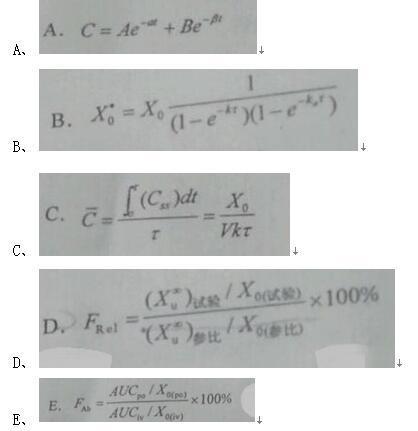 解析 没记住公式时候的解题技巧:双室找+号选A;相对生物利用度找"参比"选D ,再根A和D推理得知C是浓度公式,E是生物利用度公式,排除法只剩下B、