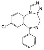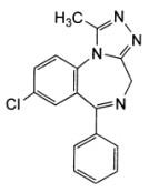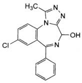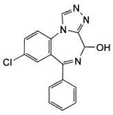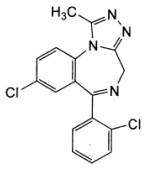 解析 本题考查艾司唑仑的化学结构式。这类苯二氮类镇静催眠药的特点是在苯二氮环1,2位上并合三唑环,从而增加该类药物对代谢的稳定性,并提高其与受体的亲和力。类似的有阿普唑仑(C)、三唑仑(E)。BD为其代谢产物,故本题答案应选A。