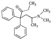 本题考查要点是“氨基酮类——美沙酮”。氨基酮类药物可以看作是仅仅保留吗啡结构中A环的类似物,也可以被称为二苯基庚酮类或苯基丙胺类,为高度柔性的开链吗啡类似物。其代表药物是美沙酮。美沙酮的左旋体镇痛作用强,右旋体作用极弱,药用其外消旋体。其化学结构是:
