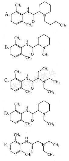 解析 【精析】本题考查2,6-二甲基酰胺类药物的化学结构。本题的答案均为2,6-二甲基酰胺类药.物的化学结构,其差别是取代基不同。故本题选A答案。 【避错】注意区分其他几个选项,B项为哌啶环N连甲基,为甲哌卡因。D项为哌啶环N上连丙基,为罗哌卡因。A项为哌啶环N上连丁基,所以为布比卡因,而C为依替卡因,E为利多卡因。