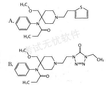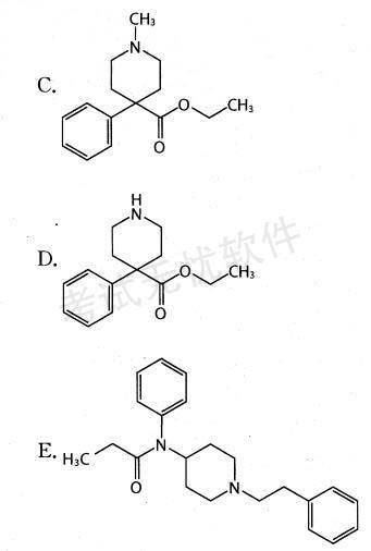 解析 【精析】本题考查药物的结构特点。芬太尼含有酰胺结构,故选E答案。 【避错】本题部分考生易选A或B,选项中的药物均属于哌啶类合成镇痛药,芬太尼含有酰胺结构,故首先排除答案C和D,C为哌替啶的结构,D为哌替啶代谢产物的结构,A、B二答案虽含有酰胺结构,但都另外含有杂环,A为舒芬太尼,B为何芬太尼。