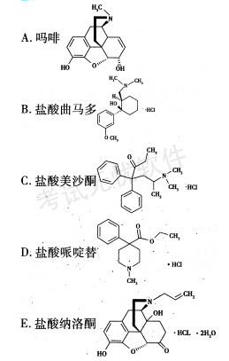 解析 本组题考查的是镇痛药的结构和药理特点。 镇痛药依来源不同分为三类:①吗啡类生物碱,如盐酸吗啡;②半合成镇痛药,有吗啡羟基焼基化物(如盐酸羟考酮)、吗啡羟基酯化物(如海洛因)、吗啡N-烷基化和14-羟基化物(如盐酸纳洛酮)、6,14-亚乙基衍生物(如二氢埃托啡);③合成镇痛药,有吗啡喃类(如酒石酸布托啡诺)、苯吗喃类(如喷他佐辛)、哌啶类(如盐酸哌替啶、枸橼酸芬太尼)、氨基酮类(如盐酸美沙酮);④其他合成镇痛药,如盐酸曲马多。盐酸美沙酮为氨基酮类,作用于与吗啡相当,但成瘾性发生较慢,作用时间长,由于戒断症状轻,常用作海洛因等成瘾造成的戒断症状,称为“美沙酮维持疗法”。吗啡的N-甲基被烯丙基取代得到纳洛酮,后者对所有阿片受体均起拮抗作用,用于吗啡中毒时的解救药物。