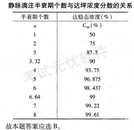 解析 本题考查稳态血药浓度。 不论何种药物,达稳态相同分数所需半衰期的个数相同。见下表: