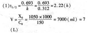 解析 本题考查单室模型静脉注射给药基本参数求算。 先将血药浓度C取对数,再与时问t作线性回归,计算得斜率b=-0.1355,截距a=2.176所以回归方程为:lgC=-0.1355t+2.176 参数计算如下: k=-2.303x(-0.1355)=0.312(h-l) lgC0=2.176C0=150(μg/ml) (2)Cl=kV=0.312x7=2.184(L/h) 故本题答案应选择CB。