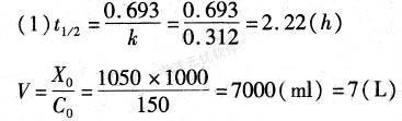 解析 先将血药浓度C取对数,再与时间t作线性回归,计算的斜率b=-0.1355,截距a=2.176 所以回归方程为:lgC=-0.1355t+2.176 参数计算如下: k=-2.303x(-0.1355)=0.312(h-1) lgC0=2.176 C0=150(ug/ml) (2)Cl=kV=0.312x7=2.184(L/h)。