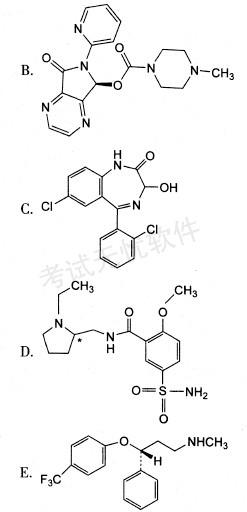 解析 重点考查佐匹克隆的化学结构。A为唑吡坦,C为劳拉西泮,D为舒比利,E为氟西汀。故本题答案应选B。