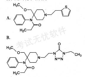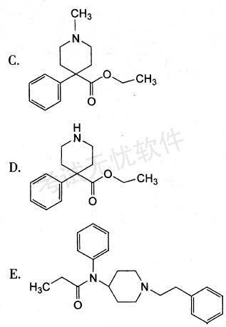 解析 本题考查药物的结构及其差别。均属于哌啶类合成镇痛药,而芬太尼含有酰胺结构,故首先排除答案C和D,C为哌替啶的结构,D为哌替啶代谢产物的结构,A、B二答案虽含有酰胺结构,但都另外含有杂环,A为舒芬太尼,B为阿芬太尼,故本题答案应选E。本题利用排除法也可选出正确答案。