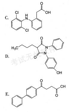 解析 本题考查药物的立体结构与代谢过程。根据所给选项的结构,首先找出具有手性中心的药物,只有A异丁苯丙酸、D羟布宗含有手性碳原子,而只有异丁苯丙酸在体内可将R(-)异构体转化为S(+)异构体而起作用,所以异丁苯丙酸药用其外消旋体,不需分离。B为美洛昔康,C为双氯芬酸,E为芬布芬的结构。故本题答案应选A。