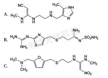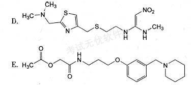 解析 本题考查雷尼替丁的化学结构式。A为西咪替丁,B为法莫替丁,D为尼扎替丁,E为罗沙替丁;雷尼替丁属于呋喃类,含有吱喃环,故本题答案应选C。由此可见同系列药物结构式的辨析,为考查药物结构式的一种命题方式,考生重点意。