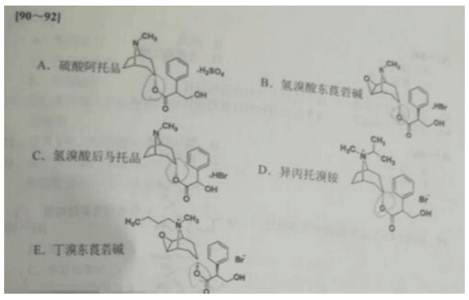 选项 A.硫酸阿托品 B.氢溴酸东莨菪碱 C.氢溴酸后马托品 D.异丙托溴铵 E.丁溴东莨菪碱