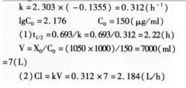 解析 先将血药浓度C取对数,再与时间t作线性回归,计算得斜率b=-0.1355,截距a=2.176所以回归方程为:lgC=-0.1355t+2.176;参数计算如下: