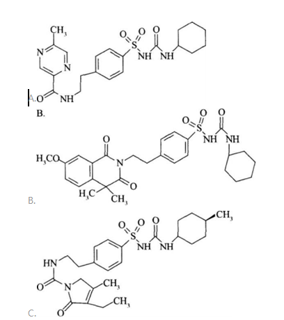 问题 将甲苯磺丁脲分子中对位甲基以芳香酰胺烷基取代,可使药物吸收迅速,与血浆蛋白结合率高,作用强且长效,毒性低。同时,将脲上的取代基更换为环己基,有显著的降血糖活性。当环己基上引入甲基,稳定性增强,因此具有高效长效的特点,代表药物是格列美脲。以此推断格列美脲的结构是