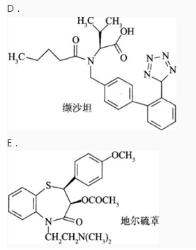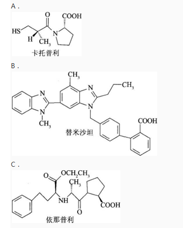 解析 本题考查的是抗高血压药物的特点。卡托普利是L-脯氨酸骨架,含有巯基的ACEI药物,有皮疹、味觉等障碍,与巯基有关;替米沙坦属于AⅡ受体拮抗剂,联苯结构,第一个不含四氮唑的药物;依那普利是前体药物,代谢成依那普利拉发挥作用;缬沙坦是不含咪唑环的AⅡ受体拮抗剂;地尔硫?是苯硫氮?类钙拮抗剂,2个手性中心,顺式右旋体活性大。