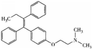 解析 如图可知,该药物为三苯乙烯类抗雌激素药物他莫昔芬,分子中具有三苯乙烯的基本结构,存在顺、反式几何异构体,药用品为顺式几何异构体,反式异构体的活性小于顺式。他莫昔芬给药后由CYP3A4进行脱甲基化得到其主要的代谢物N-脱甲基他莫昔芬,具有抗雌激素活性,属于雌激素调节药物,通过与雌激素竞争雌激素受体,从而用于治疗雌激素水平过高所引起的肿瘤,故本题答案选B。