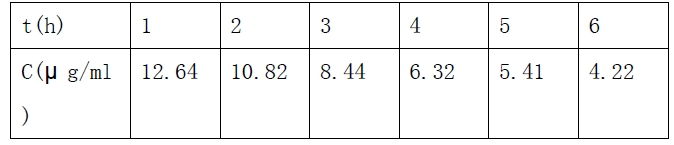 问题 给某患者静脉注射一单室模型药物,剂量为150.0mg,测得不同时刻血药浓度数据如下表。初始血药浓度为16.88μg/ml。 该药物的半衰期(单位h)是