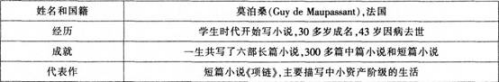 解析 【参考设计】 Teaching Contents: Two passages about dinosaurs and Diogenes. Class Type: Reading and writing class Teaching Objectives: (1) Knowledge objective Students can understand the knowledge about dinosaurs and Diogenes and master the writing skills to describe people and objects. (2) Ability objective After learning the materials, students' ability of writing and reading will be well developed. (3) Emotional objective Students can get more information about dinosaurs and Diogenes and become more interested in science. Teaching Key and Difficult Point: How to describe people and objects in writing. Teaching Aid: Multi-media Teaching Procedures: Step 1 Wanning up and Lead-in (5 minutes) (1) Greeting. (2) lead in the topic of dinosaurs and Diogenes by playing a video to students in three minutes. Then ask one student to tell his/her impressions of the video. (Justification: This step can attract students to the lesson.) Step 2 Reading and Listening (7 minutes) (1) Listen to the tape about the dinosaurs. (2) Answer the following questions according to the first passage. Are all the dinosaurs the same size What are the characteristics of the harmless dinosaurs And what are about the harmful ones Why did the dinosaurs die out suddenly (3) Answer the following questions according to the second passage. Who was Diogenes When and where did he live What did he own Did he feel happy And give an example. (4) Listen to the tape about Diogenes. (Justification: Focus students' attention on the main topic of the reading passages. The listening practice makes students have a further understanding of the passages.) Step3 Pre-writing (5 minutes) (1) How to describe people or objects (what, who, when, where, why, how ...) Eg: (2) Pay attention to the following points when writing: Make clear of the wh-words and present the information in details. Arrange the above information in certain order. Describe people and objects in vivid words and expressions. Write more about the important parts and less of the less important ones to make sure the passage is clearly organized. (Justification: In this part, the teacher uses the two passages given above to train students' analyzing and summarizing ability. In the process of summarizing the writing skills, students know how to write and what to write.) Step 4 While-writing (20 minutes) (1) Get students to outline the writing. Paragraph 1--introduction of Guy de Maupassant (who, when, how) Paragraph 2---achievements and masterpieces (what, how, why) (2) Some key words and expressions ... a famous writer and poet, when ... a studentwrite novels ... known ... in his thirties. In all his lifesix long novels and ... novelettes and short storiesreflect ... The best-known short story is The Necklace ... died ... (3) Give students some time to write it on paper. 请根据下表内容,用英语写一篇介绍法国著名的作家和诗人莫泊桑的短文。词数120左右。 (Justification: The activity of outlining the writing helps students strengthen what they have learned during this lesson and gives them the structure.) Step 5 Post-writing (5 minutes) (1) Editing Ask students to read their writings and check the charity of ideas of logical development of their arguments. Students need check carefully the grammar, spelling and punctuation of their writing. (2) Revising Guide students to make necessary improvements in both organisation and contents based on their editing. Revising can take several rounds, so students need to be prepared to write a second and a third draft before they submit the final draft. (Justification: This step can help raise students' awareness about how todevelop ideas and how to write compositions clearly.) Step 6 Summary and Homework (3 minutes) Summary: Retell what they have learned in this class. Homework: (1) Listen to the tape and read the text aloud. (2) Ask students to rewrite and copy their compositions. (Justification: This step can check out their writings and whether the students achieve the teaching objectives.) Blackboard Design: Teaching Reflection.