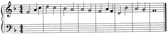 问题 为以下旋律片段配置和声,和声进行合理。 要求: (1)分析调式调性。(5分) (2)终止处用带K和弦的完满终止。(5分)