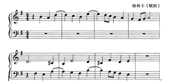 解析 此例为主题下方四度的音程模仿。倒影模仿:当应句模仿起句时,以起句的倒影来写作,即应句模仿起句时,其旋律以某音为轴加以倒置,形成旋律方向上的变化。紧缩模仿:当应句模仿起句时,其节奏按比例加以缩短,形成旋律句法长度上的变化。逆行模仿:当应句声部模仿起句时,以起句的逆行形式写作,即应句模仿起句时或乐节加以首尾倒置,形成旋律方向上的变化。