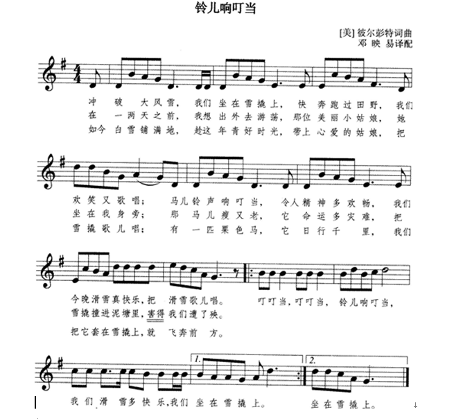 解析 (1)本曲为带再现的二段体。曲式结构为: (2)本曲为G大调。 (3)《铃儿响叮当》是一首曲调流畅、情绪欢快的美国歌曲。歌曲第一段节奏的运用,塑造了马儿奔跑、铃儿叮当的欢快的音乐形象。第二乐段上曲调的逐步上移,给人以推动感,刻画了孩子们随着雪橇冲破风雪、飞奔向前的情景。歌曲的最后乐段的重复再现。仿佛雪橇已渐渐远去,而那充满欢笑的歌声仍在风雪中回荡。