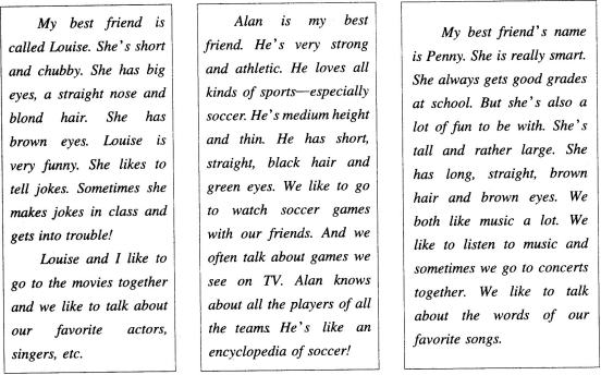 解析 Teaching Contents: These three passages are about the descriptions of friends and the things they do together. Teaching Objectives: (1) Knowledge objectives Students can learn some new words and expressions such as "chubby, athletic" to describe a friend's appearance,character, interests and what they like to do. (2) Ability objectives ①Students can develop the ability to describe a friend' s appearance, character, interests and what they like to do. ②Students can improve their listening and speaking skills. (3) Emotional objectives Students can get a deeper understanding about friendship and strengthen the friendship with friends. Teaching Key and Difficult Points: (1) How to make students learn to describe a friend. (2) How to make students improve the listening and speaking skills. Major Steps: Step 1 Pre-listening (5 minutes) The teacher asks students the following questions: (1) Who is your best friend What does he/she look like' (2) What does he/she like to do What do you usually do (Justification: Questions about students' friends can arouse their interest and prepare them for the class.) Step 2 While-listening (9 minutes) (1) Listen to the tape and fill in the blank. (2) Listen to the tape again and finish the following question of each person: What do you like to do together (Justification: This step helps students to get a better understanding about the listening material.) Step 3 Post-listening (6 minutes) (1) Show the tape scripts on the PPT. (2) Group discussion: Talk about your ideal friends. Then the teacher asks some students to share their ideas, then makes a conclusion about friendship andemphasizes the importance of friendship. (Justification: This step helps students to train their speaking abilities and further their understanding aboutfriends and friendship.) (备注:本方案设计是按照PWP模式设计的,以“听力”为主线,在听的过程中穿插“说”的活动,以提升学生的听说能力,也可以依据3P模式进行设计。)