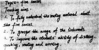 解析 (1)该教学目标的合理性体现在,试图从教学的知识目标(理解阅读材料,掌握系动词的用法)和教学能力目标(提高学生的听、说、读、写能力)这两个方面来设计。既包含了教学过程中知识内容的传授,又包含了能力培养的目标。 (2)尽管该教学目标存在其合理性,但是,总的说来,该教学目标设计得不科学,太宽泛、空洞、不具体、教学对象不明确。具体来说:①它违反了教学设计“以学生为中心,体现学生的主体地位”的原则,没有明确指出教学的主体是学生。②它没有把握好预期的教学目标,对教学内容,即知识目标的设计不明确,“理解阅读材料,掌握系动词的用法”的说法太空洞宽泛。因为知识目标指的是学生对具体语言知识,如语音、词汇、语法等方面的掌握。③对于能力目标的设计也比较笼统,因为能力目标指通过这堂课学生能够锻炼什么样的能力。它要求学生能通过感知、理解与模仿,能够在适当的情境中运用本课涉及的词组等语法知识,正确描述“人们正在做什么”,如能够正确听、说、读、写教材中的单词或句子,能够谈论教材中相关的话题等。④教学目标是三维教学目标,即知识目标、能力目标和情感态度目标,题中缺少情感态度目标。⑤此外,该教师的教学目标在书写时出现了拼写错误.系动词的英文表达应为link verbs,而非linkwords。 (3) Teaching aims Knowledge aims .. ①Students can understand the meanings of five senses according to their daily life. ② Students can fully understand the reading materials about five senses. ③Students can grasp the usage of the link verbs: smell, feel, sound, taste, etc. Ability aims : ① Students can improve their listening ability by listening to the text. ② Students can improve their speaking ability by pair work and discussion. ③Students can improve their reading ability by comprehensive reading. ④ Students can improve their writing ability by abbreviating the text. Emotional aims : ① After this lesson, students will realize the importance of five senses. ②Students can make full use of five senses in their daily life.