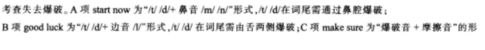 解析 式,爆破音不完全爆破;D项what time为“爆破音+爆破音”的形式,前一个发不完全的爆破音。故选A。