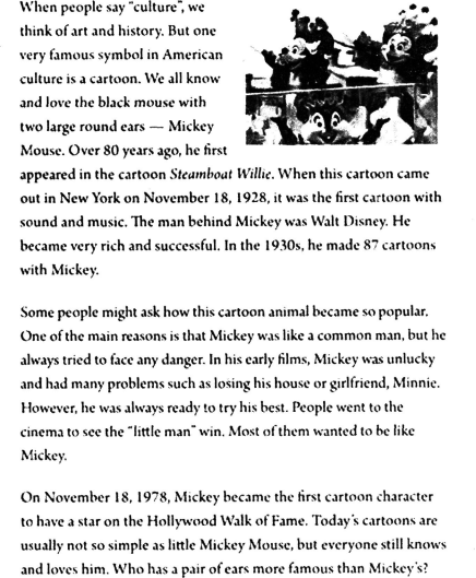 解析 Teaching Contents:The passage is about the introduction of a famous cartoon character--Mickey Mouse.Teaching Objectives: (1)Knowledge objectives Students can know more information about Mickey Mouse and understand the main idea and structure of this?passage. (2)Ability objectives ①Students can retell the passage according to the key plot. ②Students can talk about the cartoon character they like. (3)Emotional objective Students can have more interest in English. Teaching Key Point: Students can understand the main idea and specific information of the passage. Teaching Difficult Point: Students can talk about the cartoon characters which they like in daily life. Major Steps: Stepl Pre-reading(5 minutes) Show some pictures about Mickey Mouse on PPT and ask students two questions. ①What can you see on the picture? ②Can you guess what the passage is mainly about according to these pictures? (Justification:This activity can arouse students'interest in this passage and lay foundation for the following?steps.) Step 2 While-reading(10 minutes) (1)Fast reading ①Ask students to read the passage quickly to check whether their prediction is right and find out the main idea?of the passage. ②Ask students to scan the passage to find out some information about Mickey and fill into the blank. (2)Careful reading Ask students to read the passage carefully and have a discussion about the following questions.Then ask some?students to share their ideas. ①What is Mickey Mouse a symbol of?. ②Do you think Walt Disney is?a smart man?Why or why not? ③Why is Mickey Mouse so popular? ④Do you want to be like Mickey?Why or why not? (Justifications:Through the activity,students can get some specific information about Mickey Mouse from the?passage and develop their reading strategy of skimming and scanning.) Step 3 Post-reading(5 minutes) Ask students to work in groups of four and have a discussion:What is your favorite cartoon character?Why do?you like it? (Justifications:Students can talk about their favorite cartoon characters and improve their speaking ability.)