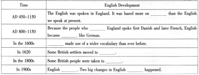 解析 Class Type: Reading class Teaching Contents: The Road to Modern English Teaching Objectives: (1) Knowledge objective Students can learn the development of English and the reasons that English has changed over time. (2) Ability objective Students can master predict the content of the text according to the tide and improve their reading abilities through the process of skimming and scanning. (3) Emotional objective Students can have a deeper impression of the popularity of English, realize the importance of learning English and have a higher motivation to learn it. Teaching Key and Difficult Points: How to make students predict before reading, get the general idea and the specific information while reading. Major Steps: Step 1 Pre-reading (6 minutes) Activity 1 Guessing game The teacher asks students to guess the meanings of the sentences which are written in old English. As fair art thou, my bonnie lass, So deep in luve am I; And I will luve thee still, my dear, Till a' the seas gang dry. Then the teacher explains the background knowledge of the sentences. (Justification: The guessing game can arouse students' interest in the topic and activate the class attnosphere. Students will realize that the old English is different from modern English when talking about the meaning of these sentences written in old English, which will get them mentally prepared for the reading comprehension.) Activity 2 Prediction Ask students to make a prediction according to the title of the text. (Justification: Students' predictions will get their mind closer to the theme of the text to be read and make their reading more intriguing and purposeful.) Step 2 While-reading (12 minutes) Activity I Skimming The teacher asks students to read the text, check if they have made the right predictions and try to match the general idea of each paragraph. Choose one or two groups to show their understanding, give comments and make a summary: Paragraph 1Many people all over the world speak English. Paragraph 2Why has English changed over time? Paragraph 3English is now spoken in South Asia. Paragraph 4Native speakers can understand each other even if they don' t speak the same kind of English. Paragraph 5Finally by the 19th centurythe language was settled. Then the teacher checks the answers. (Justification: This step will help students confirm or reject their predictions and get the main idea of the text.) Activity 2 Filling in the blanks The teacher asks students listen to the recording of the text, underline the phrases that have something to do with the time and then fill in the form. Then the teacher checks the answers. (Justification: In the process of filling the form, students' reading skill of scanning for the detailed information will be improved, and it will help student understand the text logically.) Step 3 Post-reading (7 minutes) Activity 1 Retelling T: Suppose you are an English teacher, and you have to give a brief introduction of the development of modern English to your students. Then the teacher asks one of them to show his/her retelling. Activity 2 Group discussion The teacher lets students discuss the question why has English changed over time in groups and asks some of them to share their opinions in class.(The answers may vary. But it doesn't matter what their answers may be. The most important thing is to encourage them to express their own thoughts.) The teacher then makes a summary and emphasizes the importance of learning English. (Justification: Retelling will make students have a better understanding of the text, and the group discussion will encourage them to express their opinions freely.)