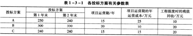 3.假设该工程有效标书经评标专家的评审,其中A、B、C三家投标单位投标方案的有关参数,如表1-3 -1所示。若基准折现率为10%,且已知A方案寿命期年费用为72. 40万元人民币;B方案寿命期年费用为69. 93万元人民币。试计算C方案寿命期年费用,并利用年费用指标对三个投标方案的优劣进行排序。(小数点后保留两位)