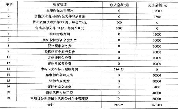 (2)理由:表2-5 -5中,图纸押金和投标保证金是需要退还的资金,不能计入收入;招标工作人员餐费、住宿费、通讯费等已计入代理公司企业管理费,不能再计入支出;根据招标代理双方达成的协议,招标代理服务费按《招标代理服务收费管理暂行办法》规定的标准下浮5%,应按286425元计算。