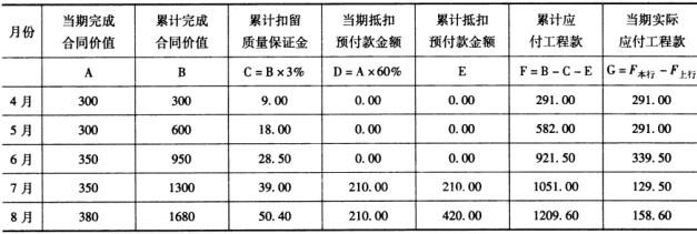 该工程当年4月开始施工。根据实际工程进度,承包人完成合同价值的情况如表3 -4 -5所示。