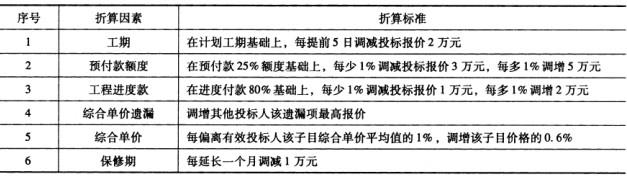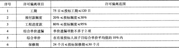 如果预付款为签约合同价的25%,每少1%凋减投标报价3万元,每多1%调增5万元;月工程进度款为月应付款的80%,每少1%调减投标报价1万元,每多1%调增2万元;保修期为24个月。假定承包人每提前5日交付给发包人带来的效益为2万元,保修期每延长一个月,发包人少支出维护费1万元。招标文件许可的偏离项目和偏离范围见表3 -6 -16。