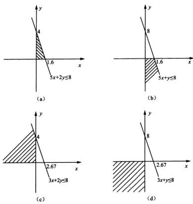 (1)当x>0,y>0时,5χ +2y≤8,满足要求的数组(x,y)为图3-6 -1(a)中平面阴影部分的点;