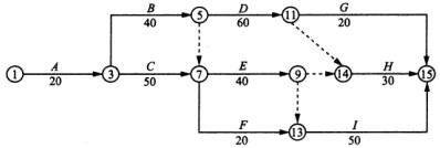 1.由于施工机械的限制,C、E、I三项工作(施工使用同一台运输机械)和B、D、H三项工作(施工需使用同一台吊装机械)只能按顺序施工,不能同时平行进行的要求对初始网络进度计划进行如图3 -5 -8所示的调整。该调整可满足施工工艺和施工机械对施工作业顺序的制约要求。