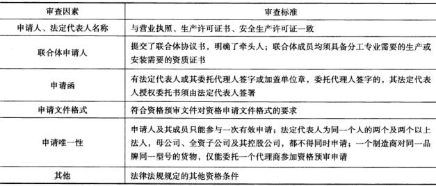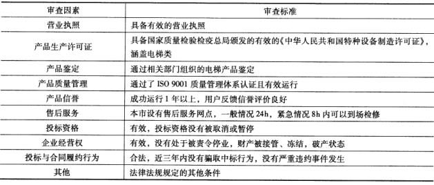(3)上述资格审查标准中,初步审查因素主要是针对申请人资格申请的一些形式审查;详细审查因素则针对申请人电梯生产许可、制造、安装以及质量验收等提出的,而营业执照、生产许可证及产品质量鉴定等,主要审查申请人独立签订合同的权利,所生产电梯是否通过了相关鉴定,是否得到了相关管理部门生产许可;审查产品质量管理的目的,在于审查申请人在电梯制造过程中的质量管理体系及相应过程质量控制;产品信誉和售后服务则审查电梯质量和申请人的社会信誉评价,进而衡量产品的可靠性与售后服务。投标资格、企业经营权、投标与合同履约行为等因素,考核申请人以往投标及履约行为。本项目由于要求中标人进行电梯安装与调试、维护与保养等工作,依据建设管理规定,增加了电梯安装资质和安全生产许可证作为审查因素,进而判断申请人是否具备这两项必备条件。