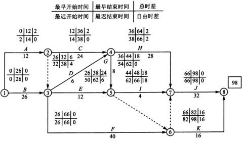关键路线即总时差为0的线路,为:①—③—⑥—⑦—⑧(或B→F→J);