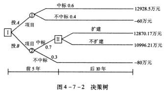由图4 -7 -2可知,在投B项目中标的情形下,扩建比不扩建的总收益净现值高,因此该情形下应选择扩建策略。