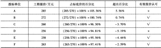 (1)根据上述工程报价资料以及必须在标底价±5%以内的规定,筛选有效工程报价,如表4 -7 -15所示。