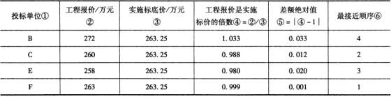 根据表4-7 -16计算结果可知,F投标单位的投标报价最接近实施标底价。即选择F投标单位为中标单位。